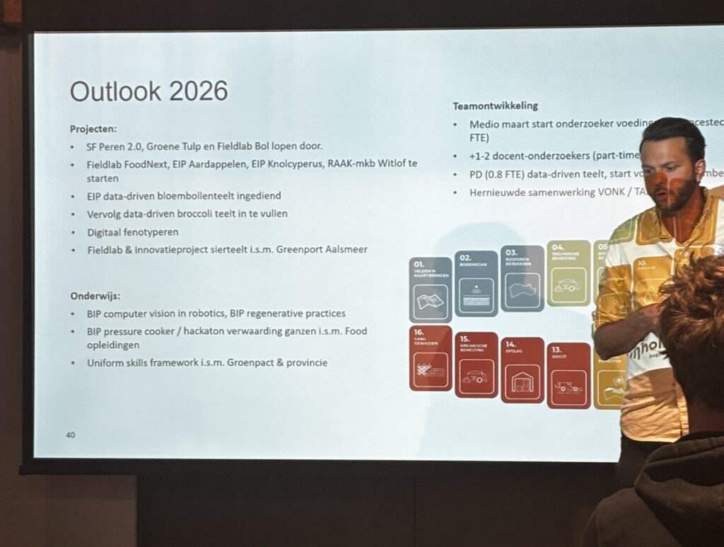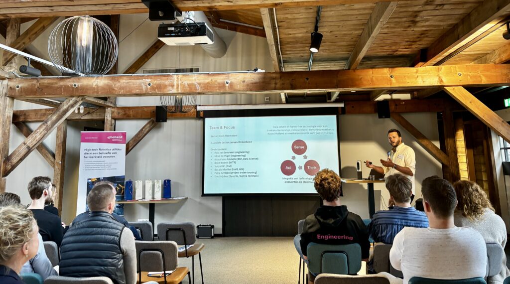 De middag werd geopend door Jeroen Wildebeest, associate lector Smart Farming, die in een korte toelichting de context schetste. De agrifoodsector staat onder druk: arbeidskrachten zijn schaars en duur, terwijl de eisen vanuit maatschappij en overheid blijven toenemen. Tegelijkertijd groeit de urgentie om slimmer en duurzamer om te gaan met middelen. De oplossing? Niet harder werken, maar slimmer. Van preventief spuiten naar gericht ingrijpen. Van handmatig werk naar precisietechnologie. Van gevoel en ervaring alleen naar data-ondersteunde beslissingen. Daarbij nuanceerde Wildebeest een hardnekkige aanname: technologie betekent niet automatisch minder werk. “Het is vooral ander werk,” stelde hij. “Het werk verschuift.”